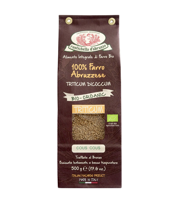 Rustichella Kus-kus od cjelovite spelte (Farro) je organski proizvod. Spelta je drevna, hranljiva vrsta pšenice. Kuskus je napravljen od cjelovitog zrna spelte. Bogat je vlaknima i hranljivim materijama.